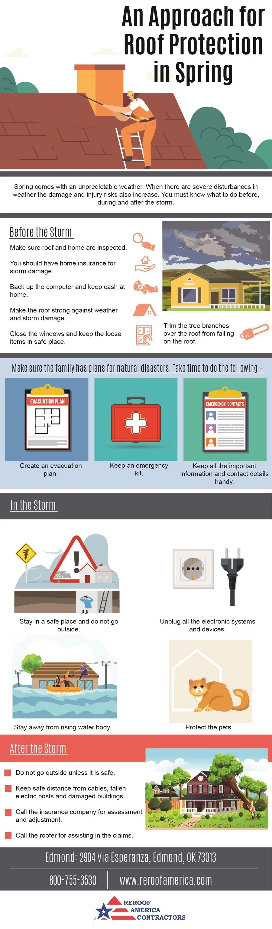 Like any other season, in the spring you need to protect your roof. Since this is the first line of defense against weather you must take it on a serious note. Spring is synonymous with unpredictable weather and storms are a regular event. Make sure to inspect the roof health before spring approaches. Besides keeping an evacuation plan, stay in a safe place during the storm and afterward call professional roofers.