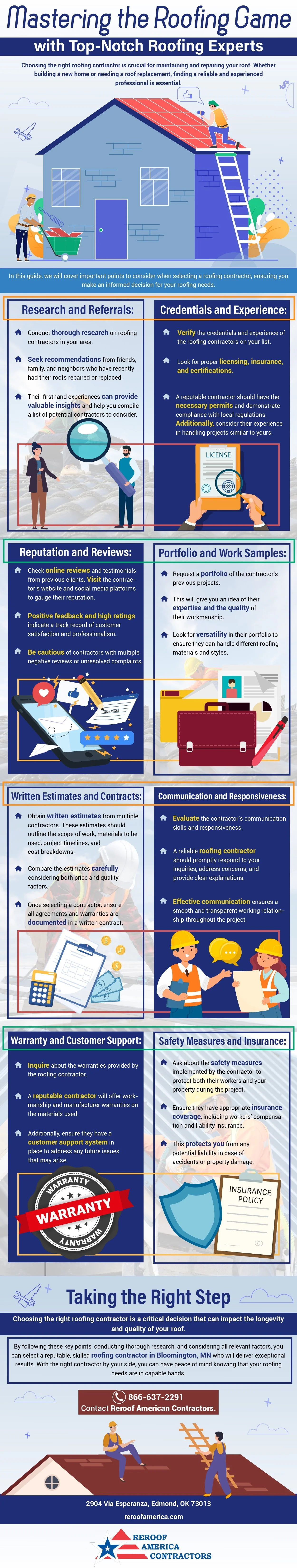 Choosing the right roofing contractor is crucial for the success and longevity of your roof. This comprehensive guide covers key points to consider when selecting a roofing contractor. Start by researching and seeking referrals, verifying credentials and experience, and assessing reputation through reviews and testimonials. Request portfolios of previous work and obtain written estimates and contracts. Communication, responsiveness, warranties, and safety measures are vital to evaluate. By following these steps, you can make an informed decision and hire a reliable and skilled roofing contractor who will deliver exceptional results, ensuring the protection and quality of your roof for years to come.