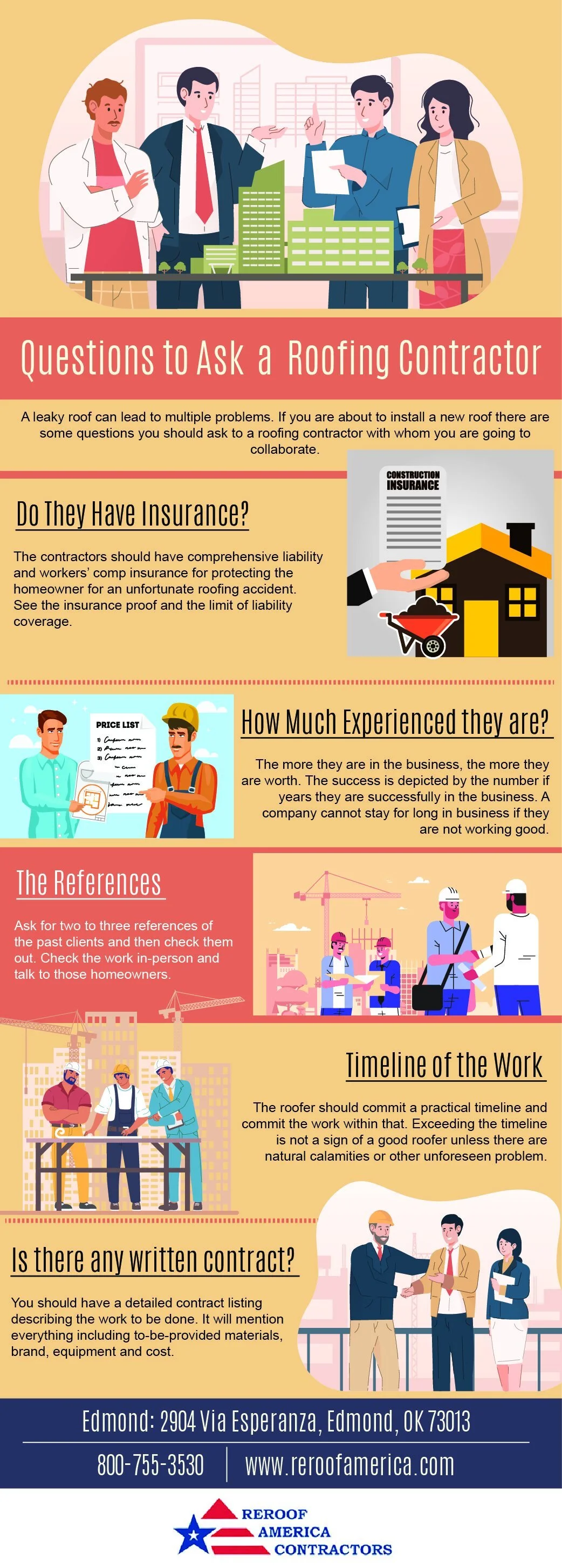 What questions you must ask to a roofing contractor? When you are handling over the roofing work to a contractor, there are certain key things you must keep on mind. Do the contractors have insurance? For hw many years they are in this field? Try to know about the feedbacks of previous customers and check the references. Do they complete their work on time and within the budget? Is there any written contract? If all these come positive, you can hire that contractor.